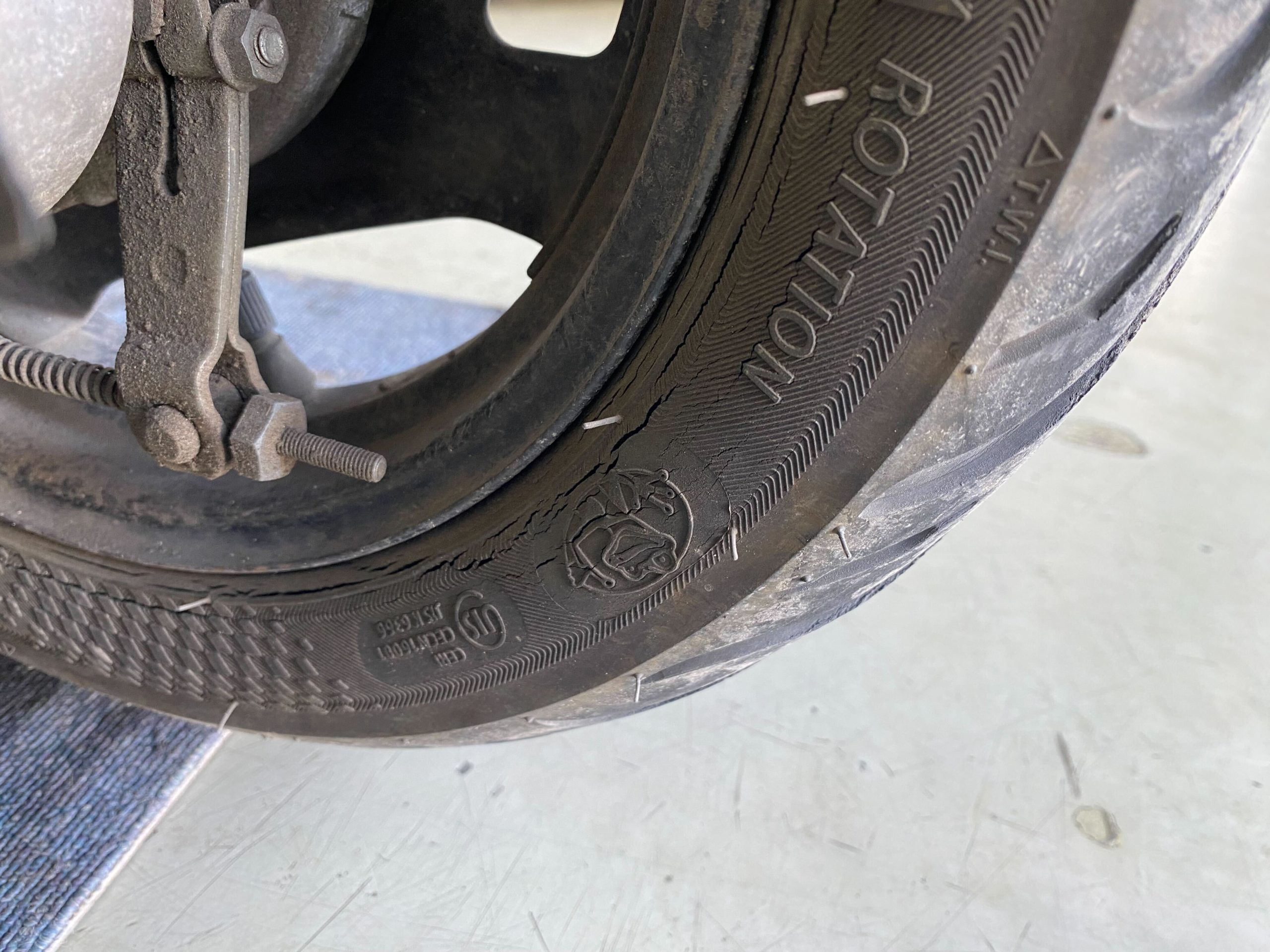 タイヤのヒビ割れや空気漏れを見つけた場合は、早めの点検・交換が安全につながります。