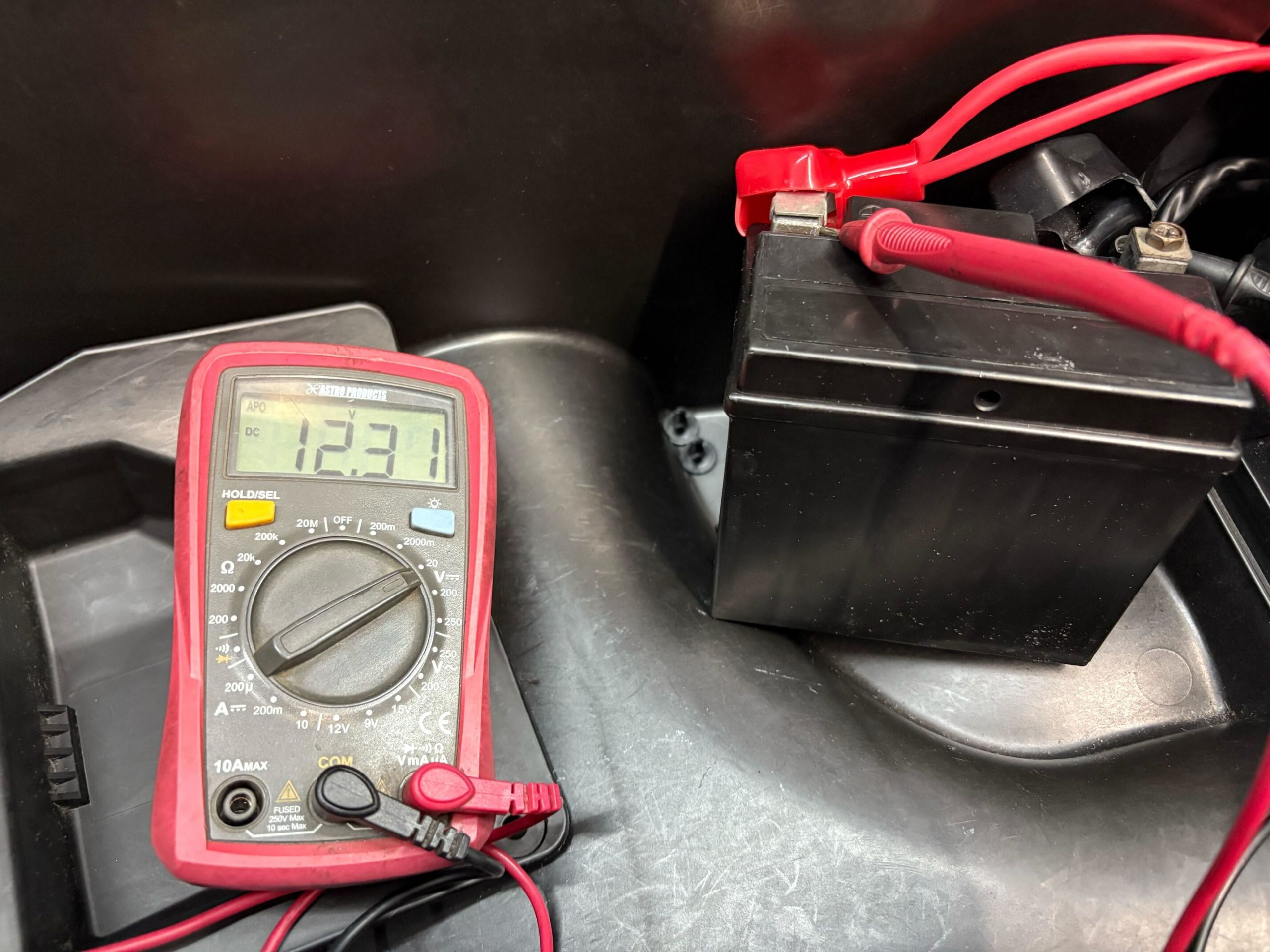 点検の結果、バッテリー電圧は約12.3Vで、セルモーターを回すには不足していました。