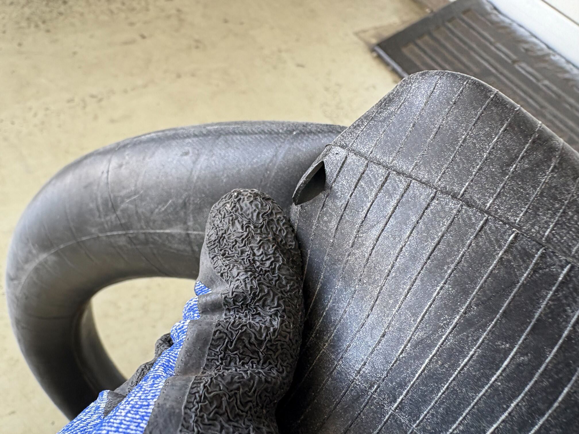 確認したところ、長さ2cmほどのネジが刺さっており、チューブには直径1cmほどの穴が空いていました。