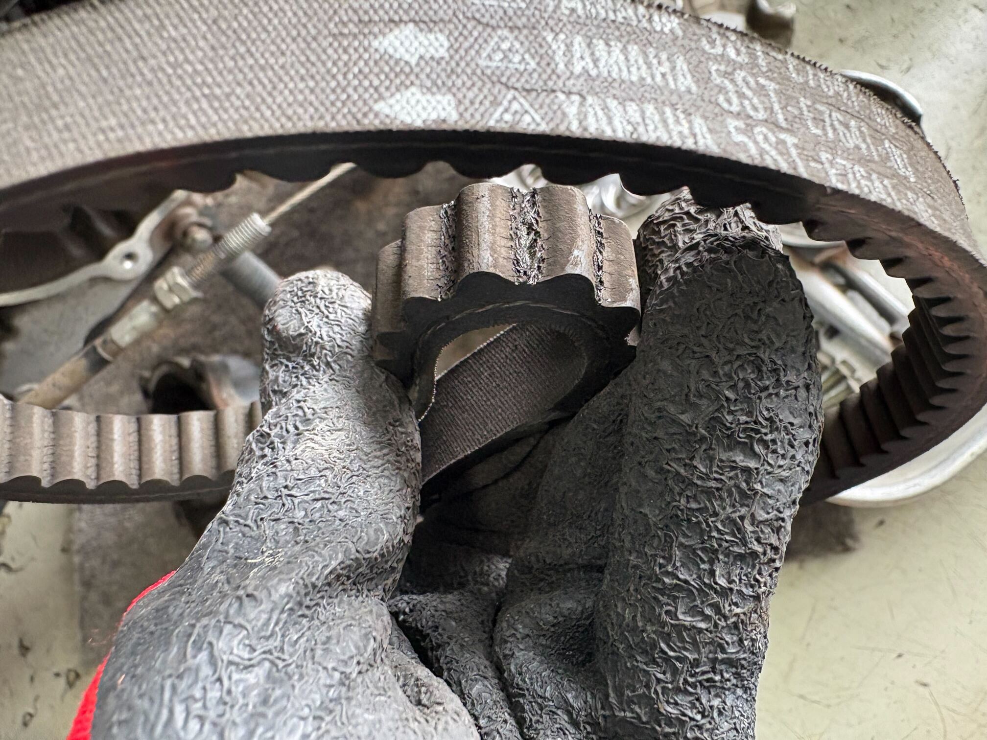 ベルトやウエイトローラーなどの消耗が見られ、駆動系整備を実施したところ症状は解消しました。