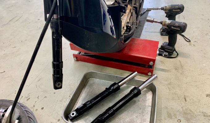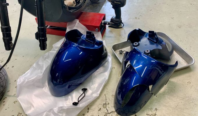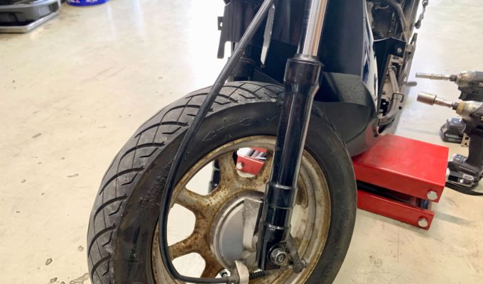 フレームやハンドルなどの主要部分には損傷がなかったため、外装とフロントフォークの交換で安全に走行できる状態に復旧しました。