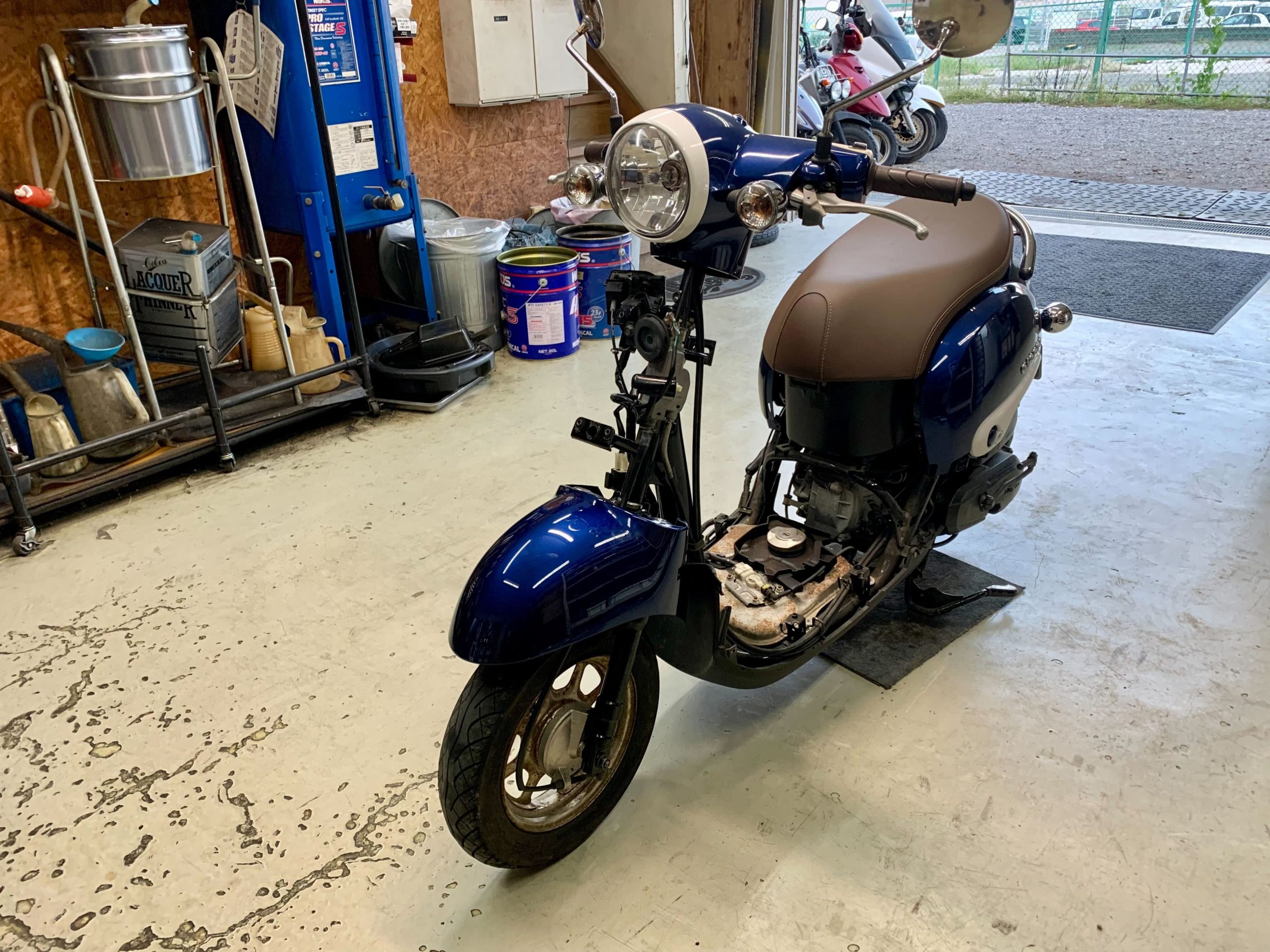 修理受付時間は11:00〜19:00です。GoogleMapで”原付市場”と検索して中古車展示場(藤沢市宮原3610-1)を選んでください。カーナビですと辿り着けないようなので、GoogleMapをおすすめします。