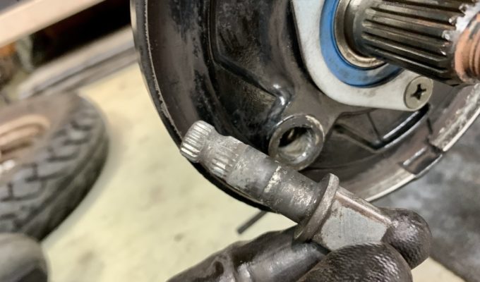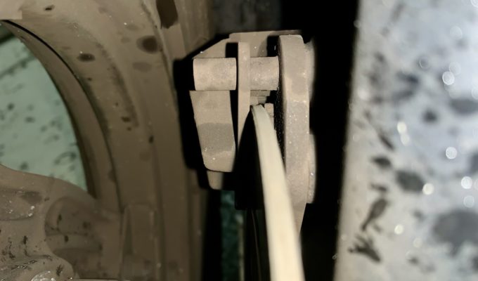 お客様が応急処置としてリアブレーキの調整ナットを緩めてくださっていたため、入庫時にはタイヤが回る状態でした。