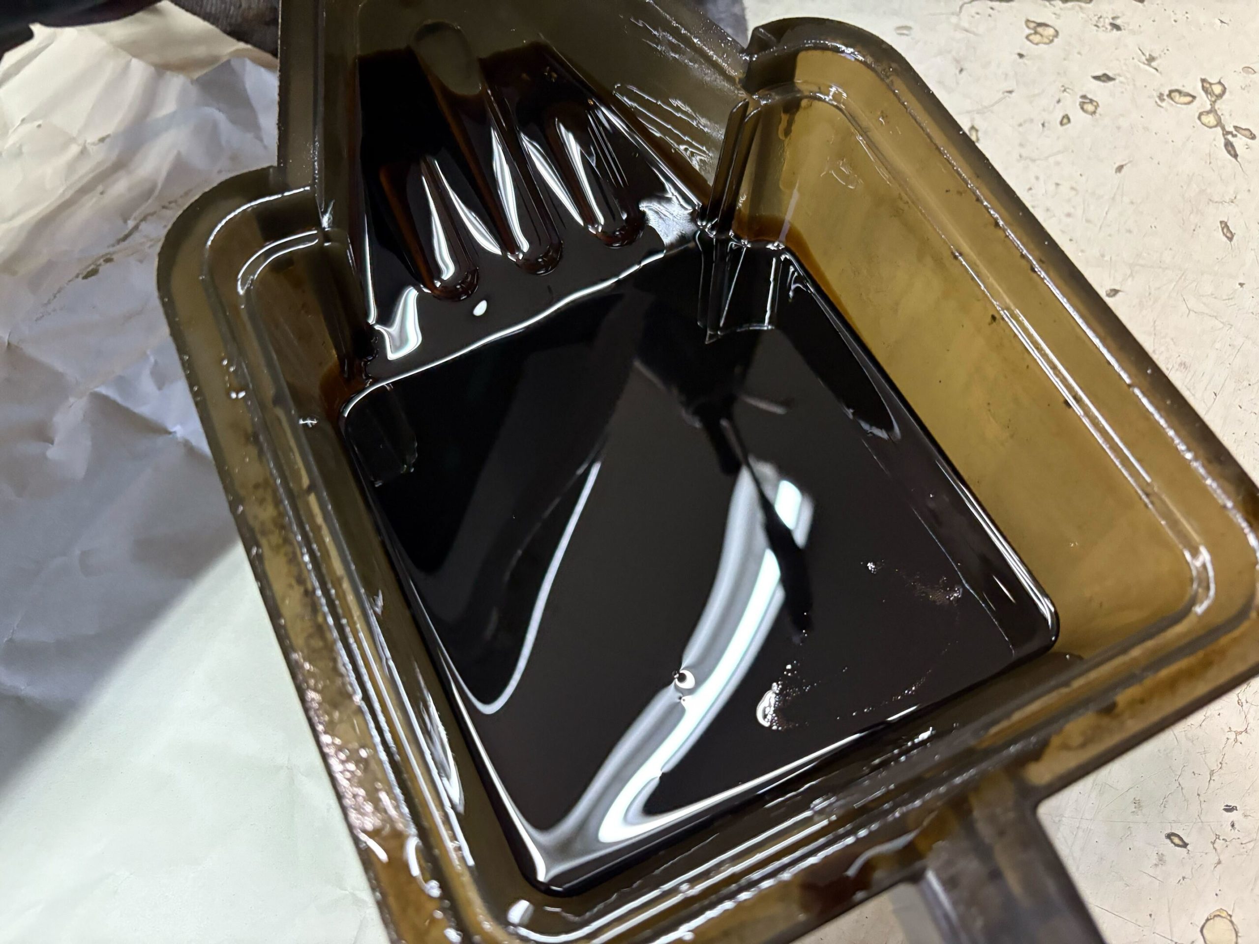 オイルゲージを確認すると、オイルは付着するものの量が少なく、真っ黒に汚れていました。