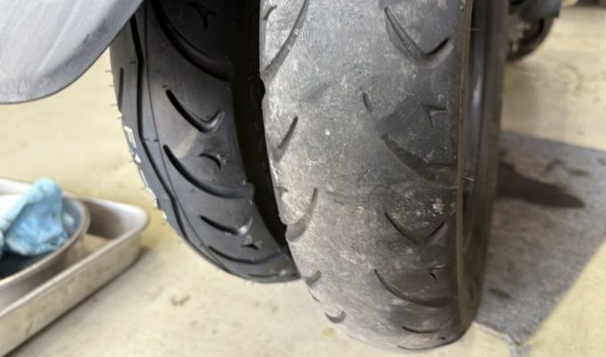 追加でリアタイヤ・エンジンオイルも交換時期でしたので、全体的な整備をご提案し、まとめて作業を承りました。