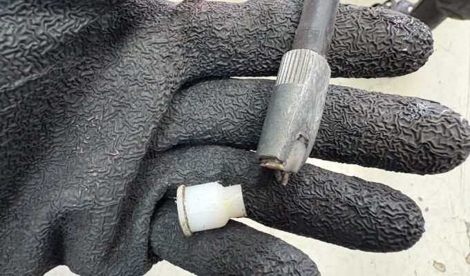 仕入れ車両の点検中、キックレバーの抵抗や始動状態から圧縮不良を確認しました。
