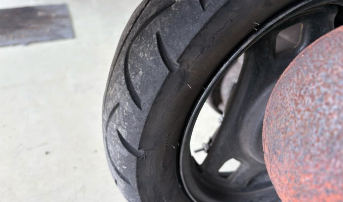 リアタイヤは完全に空気が抜けており、タイヤの製造年も古く劣化が原因と判断しました。