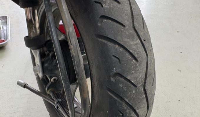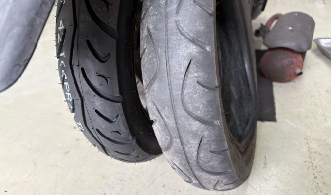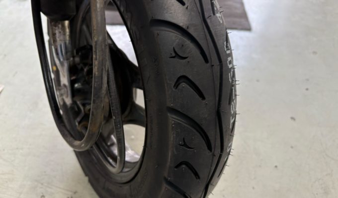 フロントタイヤも同年代の劣化が見られたため、前後セットでの交換をご案内し承りました。
