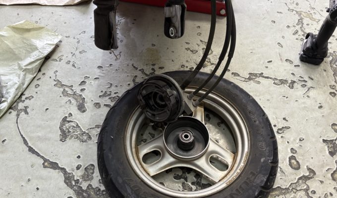 今回はフロントタイヤ交換、エンジンオイル交換、駆動系整備のご依頼です。