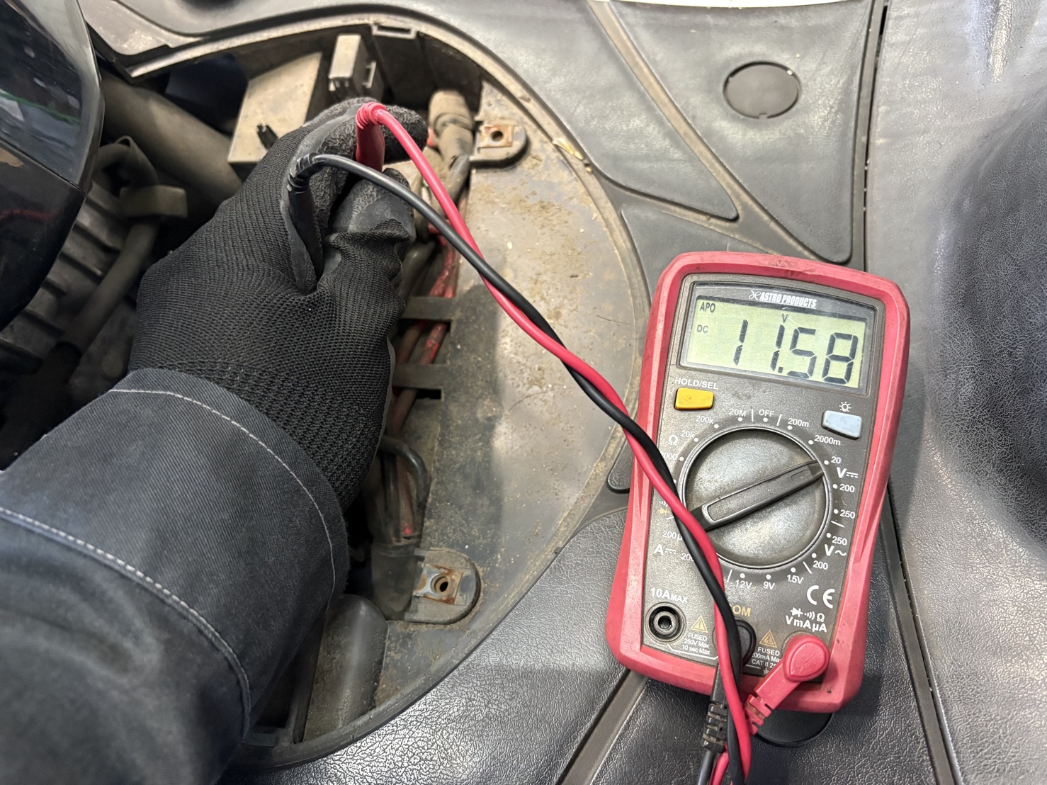 まずバッテリーの電圧を測定したところ、12V をわずかに下回る数値でした。見た目は古く、かなりの月日が経過していると判断。バッテリーの寿命は一般的に2〜3年が目安ですが、今回はそれを大きく超えていたとみられます。