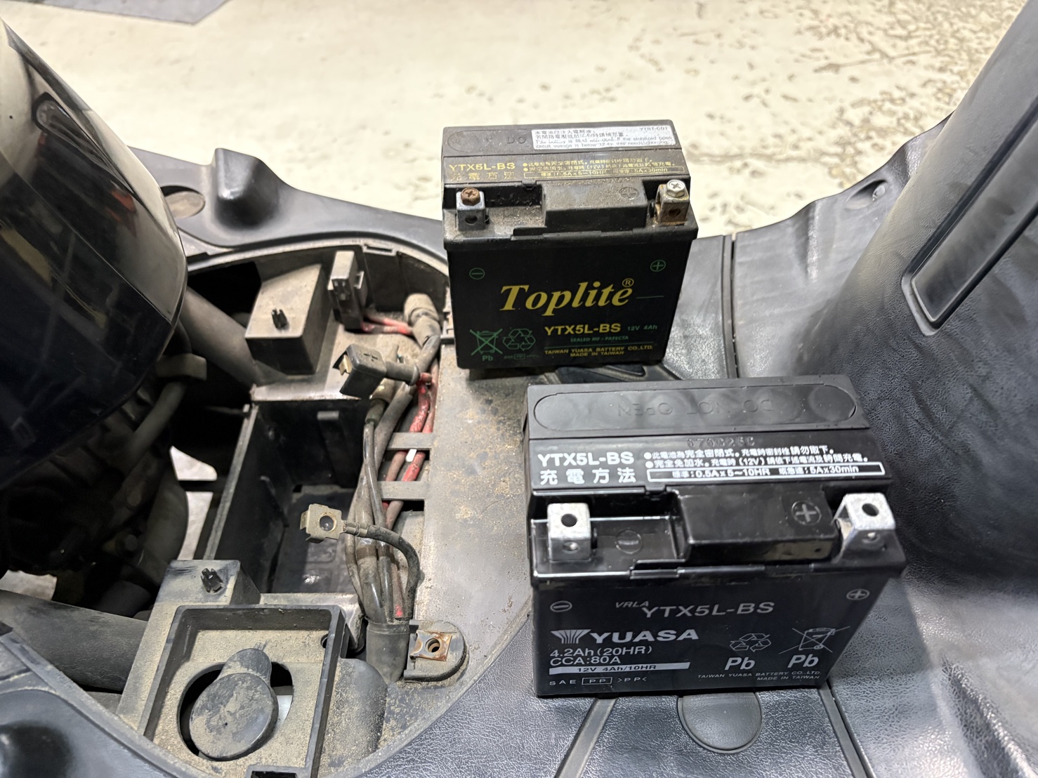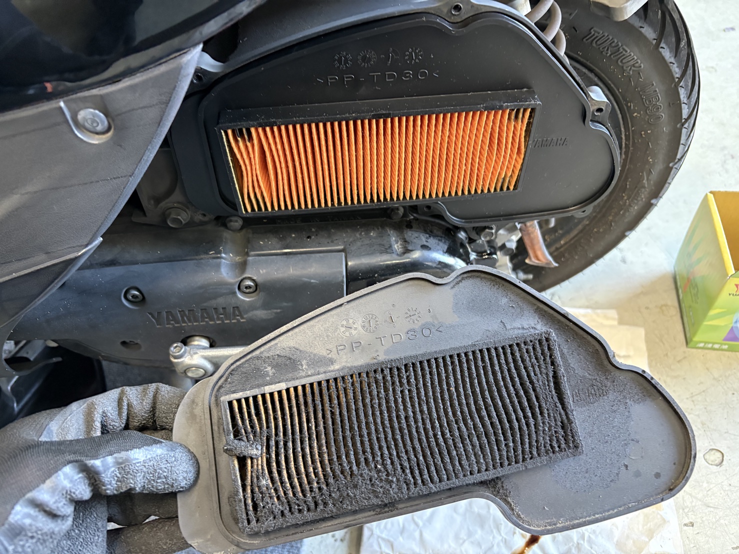 新品バッテリーを充電しながら、並行してプラグとエアフィルターの交換作業を進めました。