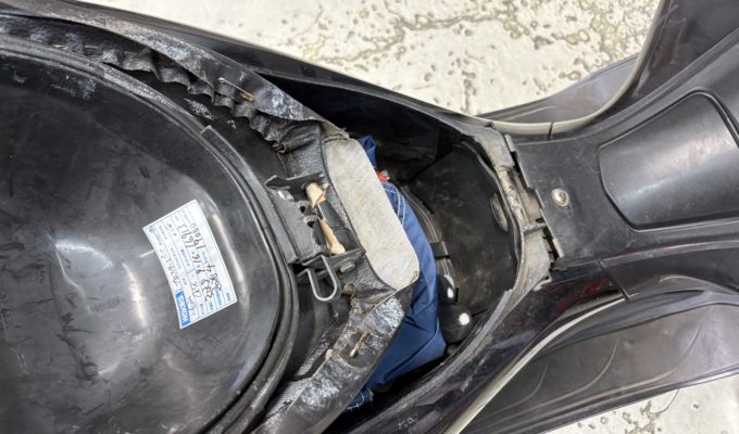 キックスターターで試したところあっさりとエンジン始動。これは電気系の問題(バッテリー電圧不足)が原因であることを裏付けています。SA36JはFI車のため、バッテリーが弱ると燃料ポンプが正常に動作せず、セルモーターも回りません。キックで始動できたのは、点火まわりが生きていた証拠です。