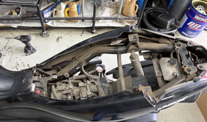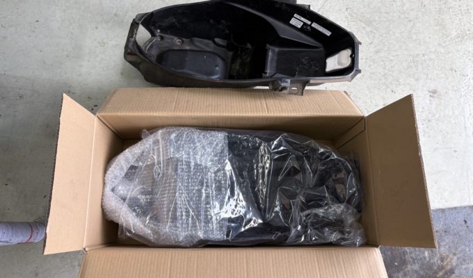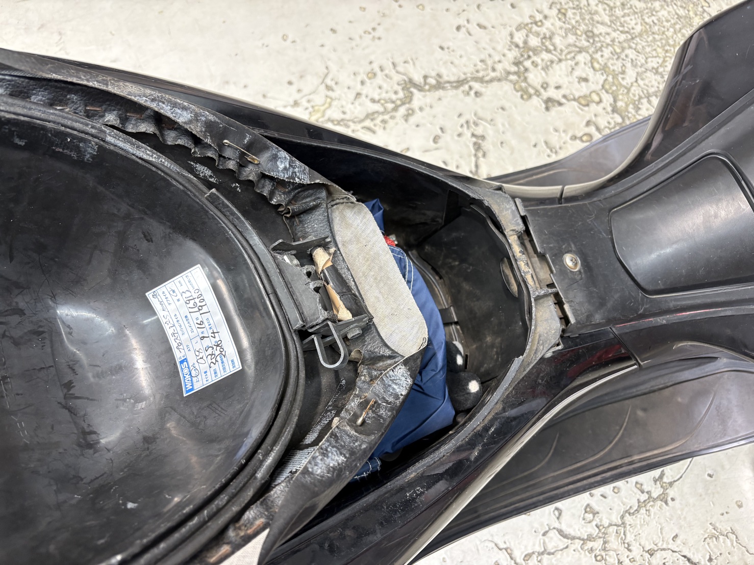 シートを開けてみると、メットイン(ラゲッジボックス)本体が完全に分離してしまっている状態でした。経年劣化や繰り返しの開閉によってプラスチック部分にひびが入り、最終的に割れてしまったと判断されます。