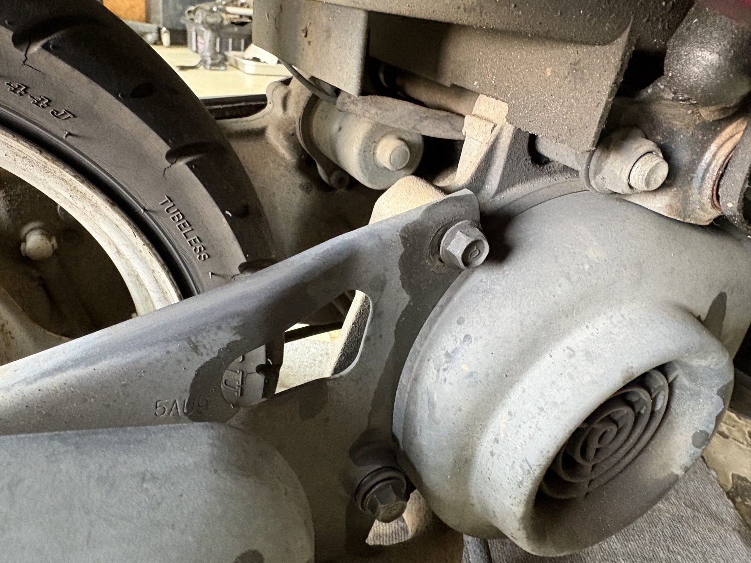 リアタイヤ交換でご来店いただいたところ、マフラーから排気漏れによる爆音が発生しているのを確認。取り外しに取り掛かったところマフラーステーのボルトが固着しており、このまま力をかけるとボルトが折れてしまうと判断し、お預かりでの修理をご提案しました。ついでに電圧がほぼゼロだったバッテリーの交換もまとめてご依頼いただきました。今回ご入庫いただいたのはヤマハ ビーノ(SA10J)です。レトロなスタイルが人気の2ストローク50ccスクーターで、年式の古い個体も多く、ボルトの固着といった経年劣化のトラブルが起きやすい車種でもあります。