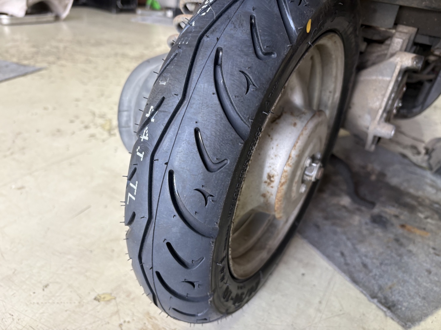 もともとのご依頼であったリアタイヤを交換しました。エアバルブも同時に新品へ交換し、空気漏れのリスクを排除しています。タイヤ交換後は空気圧を規定値に調整して作業完了です。