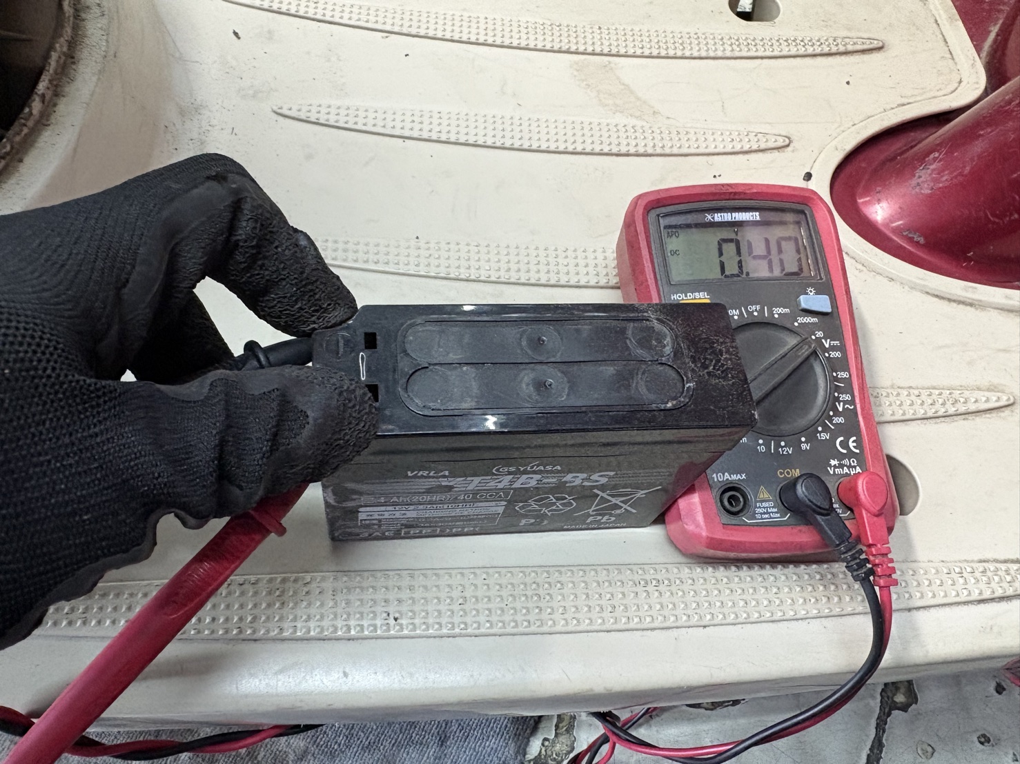 電圧がほぼゼロまで低下したバッテリーを社外品の新品へ交換。交換後にセルモーターが力強く回り、エンジン始動も問題なく確認できました。