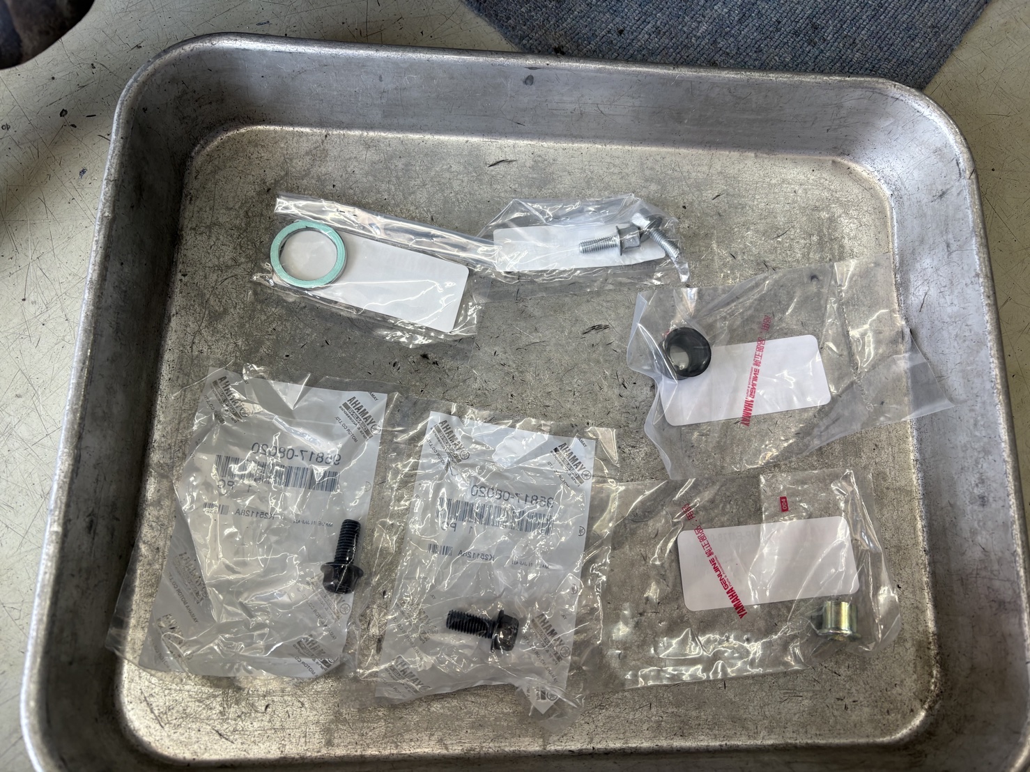 マフラー取付部のボルト4本・ガスケット・グロメットはいずれも再使用できない状態でしたので、部品が入荷次第すべて新品へ交換しました。