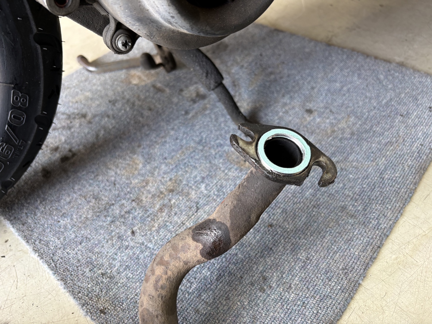 また、排気漏れの根本原因を調べると、シリンダー下のマフラー取付ボルトが1本紛失、残る1本も緩々の状態でした。密着が失われたことでガスケット周りから排気ガスが漏れていたことが判明しました。