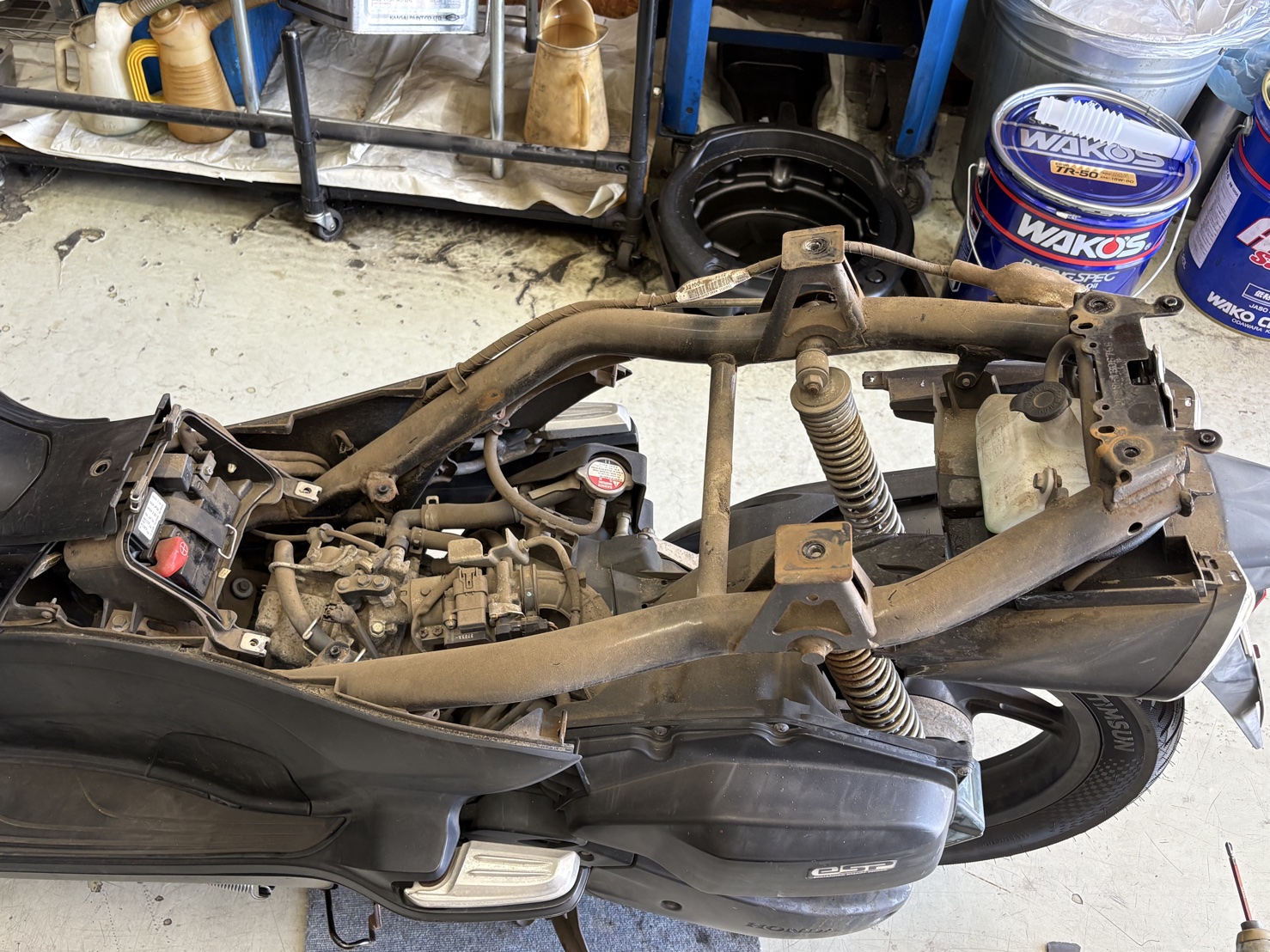 漏れ箇所を特定するためリア側の外装を取り外し、ラゲッジボックスを外してリザーブタンク周辺を確認しました。