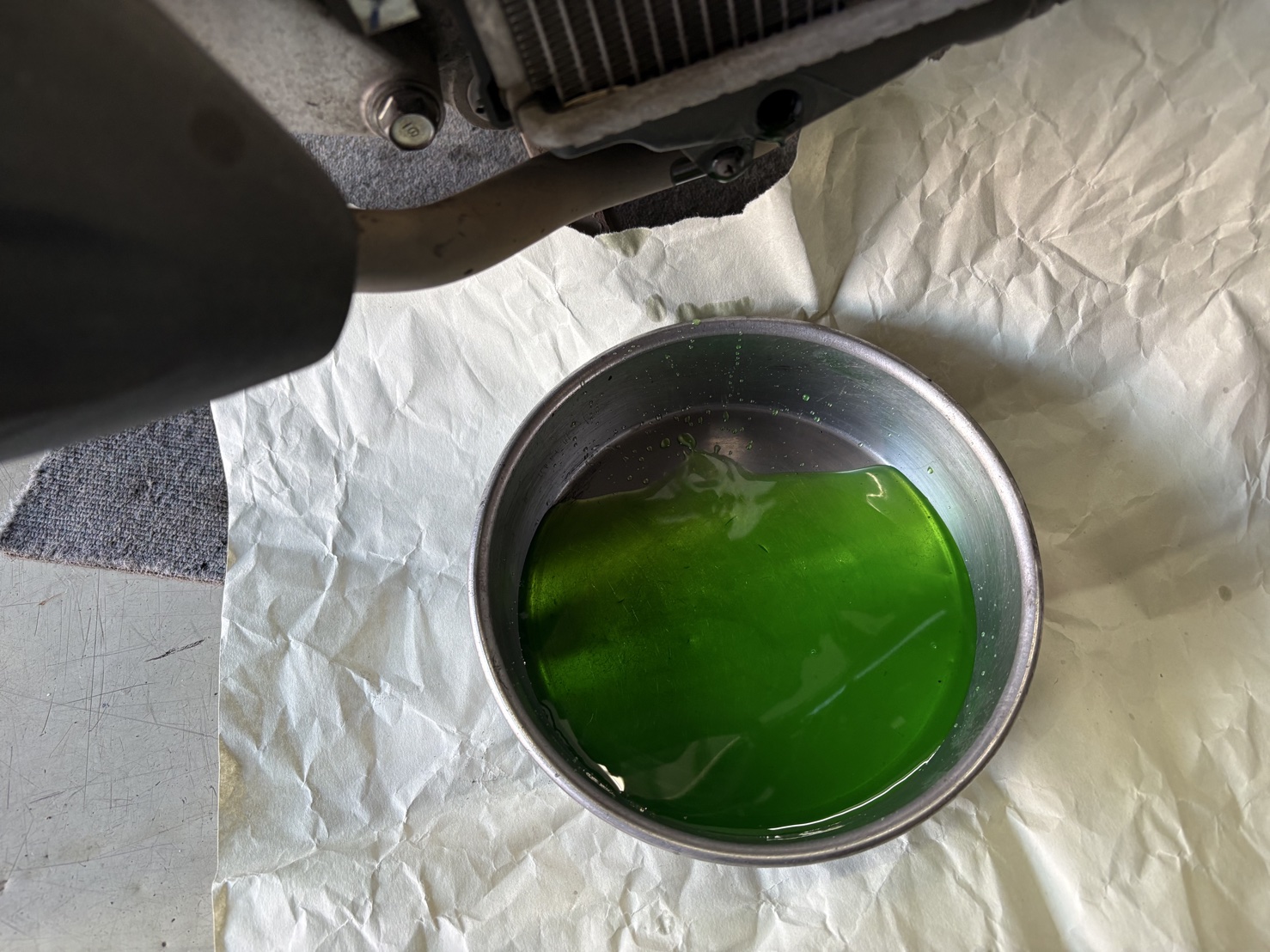 長期間交換されていなかった冷却水を全量抜き取り、新しい冷却水に入れ替えました。エア抜きを行い、暖機運転後に液面を再確認して規定量に調整しています。