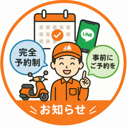 修理受付時間は10:00〜19:00です。GoogleMapで”原付市場”と検索して中古車展示場(藤沢市宮原3610-1)を選んでください。カーナビですと辿り着けないようなので、GoogleMapをおすすめします。