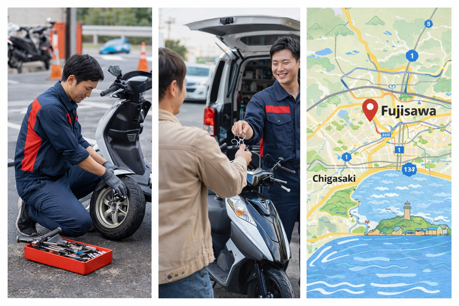 修理受付時間は10:00〜19:00です。GoogleMapで”原付市場”と検索して中古車展示場(藤沢市宮原3610-1)を選んでください。カーナビですと辿り着けないようなので、GoogleMapをおすすめします。